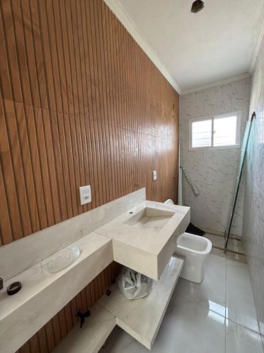 🔹 Banheiro com pia esculpida e porcelanato